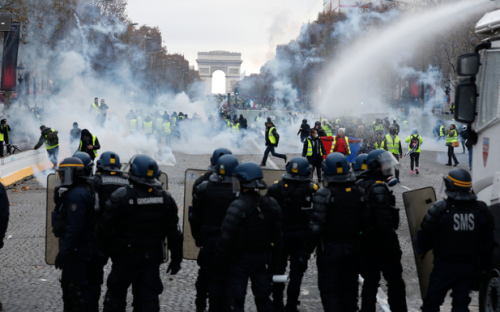 In de laatste dagen voor de demo van 24 november verhardde het vertoog zich steeds meer tot een ideologische, bijna revolutionaire boodschap, een oproep tot opstand tegen het systeem. Marine Le Pen, de leider van het extreem-rechtse Front National (dat overigens na haar nederlaag bij de jongste presidentsverkiezingen is herdoopt tot Rassemblement National) deed een tweet uitgaan waarin zij de demonstranten opriep niet akkoord te gaan met het Champ de Mars (het grote open veld naast de Eiffel-toren) dat de politie had aangewezen als plaats voor de demonstrerende gilets jaunes. Waarom, opperde Marine, niet de Champs Élysées? Aan deze oproep hebben zo’n 8000 demonstranten gehoor gegeven, met de wolken traangas en de waterkanonnen als voorspelbaar gevolg. Al was het maar omdat het presidentieel paleis dichtbij ligt, en een bestorming daarvan – gezien uitlatingen van sommige gilets jaunes – volstrekt niet denkbeeldig leek.