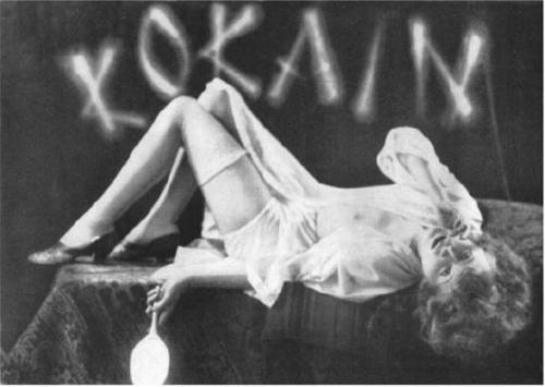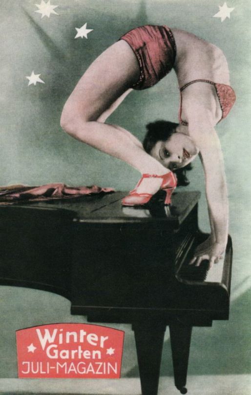 Afbeelding boven: Liv Lisa Fries als ‘Charlotte’ in Babylon Berlin. Afbeeldingen onder: 1. De befaamde naaktdanseres Anita Berber in haar succesnummer ‘Kokain’. 2. Twee kostuums uit de revue ‘Alles nackt’ (1927). 3. Reclame voor erotisch amusement (1927). (Afbeeldingen uit Voluptuous panic). 4,5,6. Stills uit Babylon Berlin.