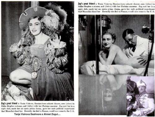 Ahmet Zogu, een legeraanvoerder die zichzelf in 1928 tot Koning Zog I van Albanië had uitgeroepen, had tijd over van het regeren en derhalve ampele gelegenheid tot een verhouding, in de jaren dertig, met een sterdanseres van de Parijse Folies Bergères, de van oorsprong Russische Tanja Visjirova. Zie de oude pagina’s uit Life hierboven. Meer weet ik er niet van – alles wat je er op internet over vinden kunt, is in het Albanees, en dat ben ik niet machtig. Ik ken het verhaal uit het nieuwste boek van de Albanese schrijver Ismail Kadare, dat net in Franse vertaling is verschenen: Matinées au café Rostand.