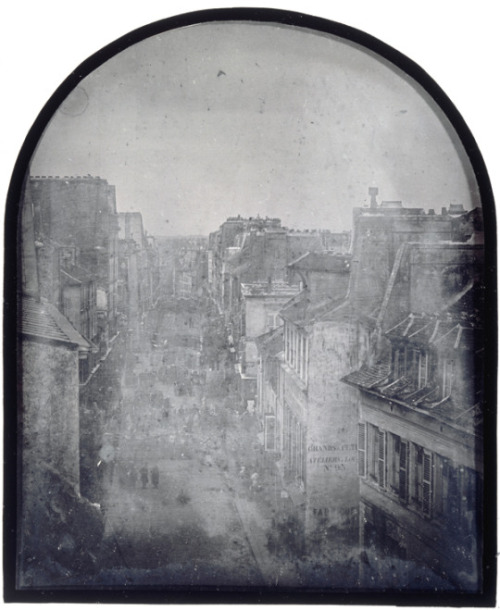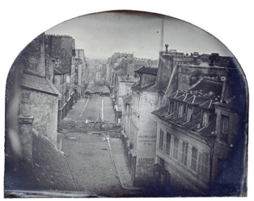 De Franse politicoloog Olivier Ihl heeft de geschiedenis van deze daguerrotypen tot de bodem uitgezocht. Tot nu toe was er niet zo heel veel meer over bekend dan dat ene ‘Thibault’ ze had gemaakt. Ihl, bezig met onderzoek naar de electorale geschiedenis, kwam de kwestie toevallig tegen en heeft, met behulp van kadasters, notariële akten en andere archieven, uitgevonden wie de daguerrotypen gemaakt heeft, en vanuit welk raam. Het resultaat is een alleraardigst boekje, La barricade renversée. Fotograaf is de in 1801 geboren Charles François Thibault, aanvankelijk een verzekeringsagent, die in de loop van zijn leven steeds meer betrokken raakte bij technische vooruitgang. Hij bezat hij het patent op een bepaald soort brandladder en was met eveneens progressief gestemde vrienden betrokken bij de ontwikkeling van een nieuw soort stoommachine. De opnamen zijn gemaakt vanuit een raam op nummer 94 in de Rue du Faubourg du Temple – een pand dat in handen was van een zekere Jean-Pierre Piver, een welgestelde tuinbouwer (in de tuinen van Belleville werd toen nog fruitteelt bedreven), die de daguerrotypen later heeft gekocht om ze thuis op te hangen. In het Musée d’Orsay zijn de afbeeldingen trouwens verkeerd gecatalogiseerd: anders dan daar op het bordje staat, zijn de barricaden niet in de Rue St.Maur, maar op het kruispunt met de Rue St Maur.