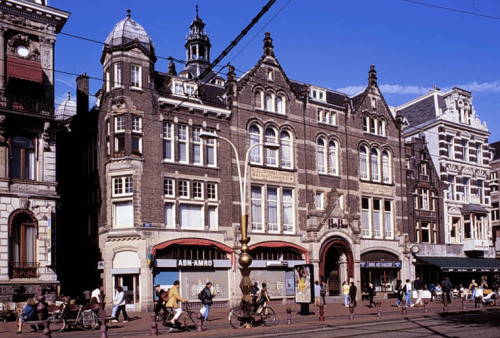 Afbeelding boven: de Heilige Stede op een Zeventiende-eeuwse prent, gezien vanaf het Rokin. Hieronder de afbraak van de Heilige Stede in 1908 en het complex dat thans op deze plek staat.