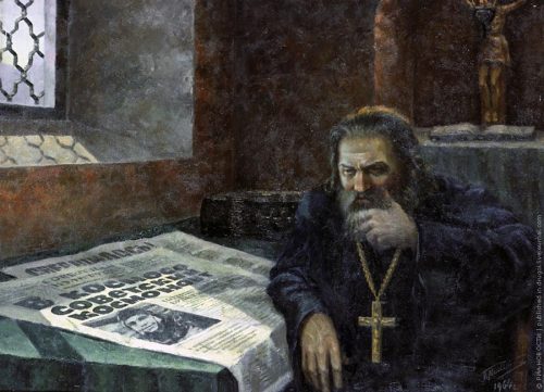 Afbeelding boven: Meditatie, Sovjet-schilderij van Pjotr Michailov uit 1964. (Orthodoxe monnik wordt door vragen overmand na lezing van een krantenbericht over de eerste Sovjet-kosmonaut, Joeri Gagarin). Afbeeldingen onder: 1. Sovjet-propagandaposter waarop een kosmonaut enthousiast ‘Geen God’ roept. 2. Button van de Franse vrijdenkersorganisatie La libre pensée: Religies, nee dank u.