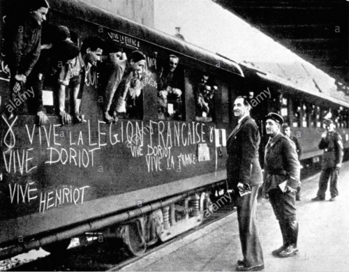 Afbeelding boven: Philippe Henriot in zijn werkkamer op het ministerie, met achter zich een portret(je) van maarschalk Pétain. Afbeelding onder: op de dag voor zijn liquidatie, 27 juni 1944, zwaait Henriot in Parijs een trein met vrijwilligers uit, die in Duitsland gaan werken.