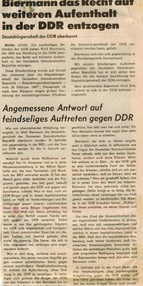 Afbeeldingen. Boven een beeld van het concert in Keulen. Onder Biermann voor de Preussische adelaar op de brug over de Spree. Daaronder de publicatie in het Oost-Duitse partijblad Neues Deutschland, waarmee Biermann in 1976 de verdere toegang tot de DDR ontzegd wordt.