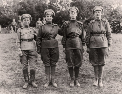 De foto’s bij dit blog geven een indruk van de vrouwelijke zelfmoord-bataljons, zoals die onder de regering van Kerenski werden ingesteld om het moreel van de vaak muitende troepen op te vijzelen. De bedoeling was dan dat vrouwen als eersten de loopgraven verlieten om met de bajonet het Duitse spervuur in te lopen – waarop de mannelijke soldaten dan zouden denken dat ze toch moeilijk konden achterblijven. De meeste vrouwelijke bataljons bleven trouwens in Petrograd, bijvoorbeeld om het Winterpaleis, waar de regering zetelde, te bewaken. De foto onder is gemaakt bij het bezoek van de Britse feministe Emmeline Pankhurst, die in 1917 Petrograd bezocht om haar Russische zusters in de oorlog een hart onder de riem te steken. Ze staat naast de befaamde vrouwelijke commandant van een der dames-bataljons, Maria Botsjkarjova.