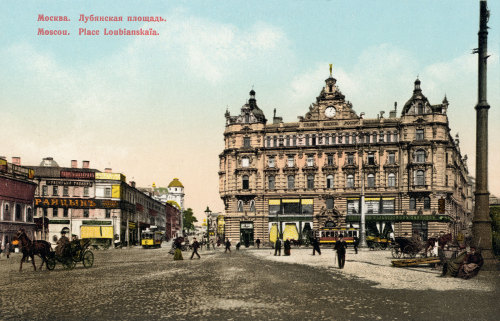 Afbeeldingen onder: De Loebjanka in 1910 en nu. Het in 1898 gereed gekomen gebouw was aanvankelijk het kantoor van de verzekeringsmaatschappij Rossija. Begin jaren twintig werd het betrokken door de Tsjeka, de eerste geheime dienst van de Sovjet-Unie. Zijn huidige vorm kreeg het door verbouwingen in de jaren vijftig en tachtig. Op de laatste foto, vermoedelijk uit de jaren tachtig, is nog het standbeeld van Feliks Dzerzjinski, de eerste chef van de Tsjeka te zien, dat ik 1991 is verwijderd. De FSB, opvolger van de KGB, is er nog steeds gevestigd.