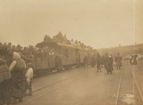 Afbeeldingen zijn van Van Tienhoven: De verbandkamer van het ziekenhuis in Valjevo (boven), en de vlucht per trein uit Valjevo voor de oprukkende Oostenrijkse troepen (onder). Beide foto’s uit 1915.