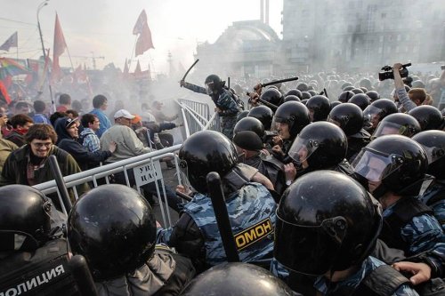 Foto: Oproerpolitie in 2012 in actie tegen vreedzame demonstranten op het Bolotni-plein in Moskou, bij rellen die volgens sommigen veroorzaakt waren door provocateurs van het regime. Tientallen, soms willekeurig opgepakte demonstranten zijn inmiddels veroordeeld, soms tot jaren kamp en gevangenis. Tegen anderen loopt, meer dan vijf jaar na de gebeurtenissen, nog steeds strafvervolging – kennelijk wil de overheid de druk op de ketel van repressie houden.