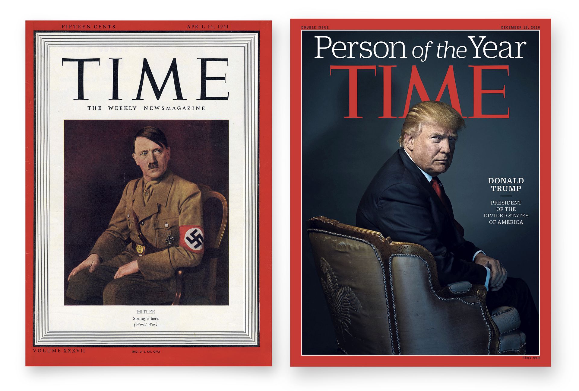 Afbeelding boven: de covers van Time’s jaarlijkse ‘person of the year’ verkiezing, de edities 1938 en 2016. Onder: straatbeeld in Berlijn 1933