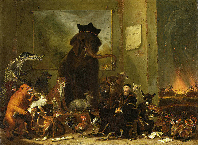 Afbeelding boven: Satire op het proces tegen Oldebarnevelt van Cornelis Saftleven, uit 1683. De 24 rechters zijn als beesten afgebeeld. De olifant, met voorzittersmuts, is Nicolaas Cromhout, president van het Hof van Holland. De pauw is de Amsterdamse regent Reynier Pauw, een felle contra-remonstrant. Rechts wacht het vuur van de hel op de rechters.(Rijksmuseum, Amsterdam)