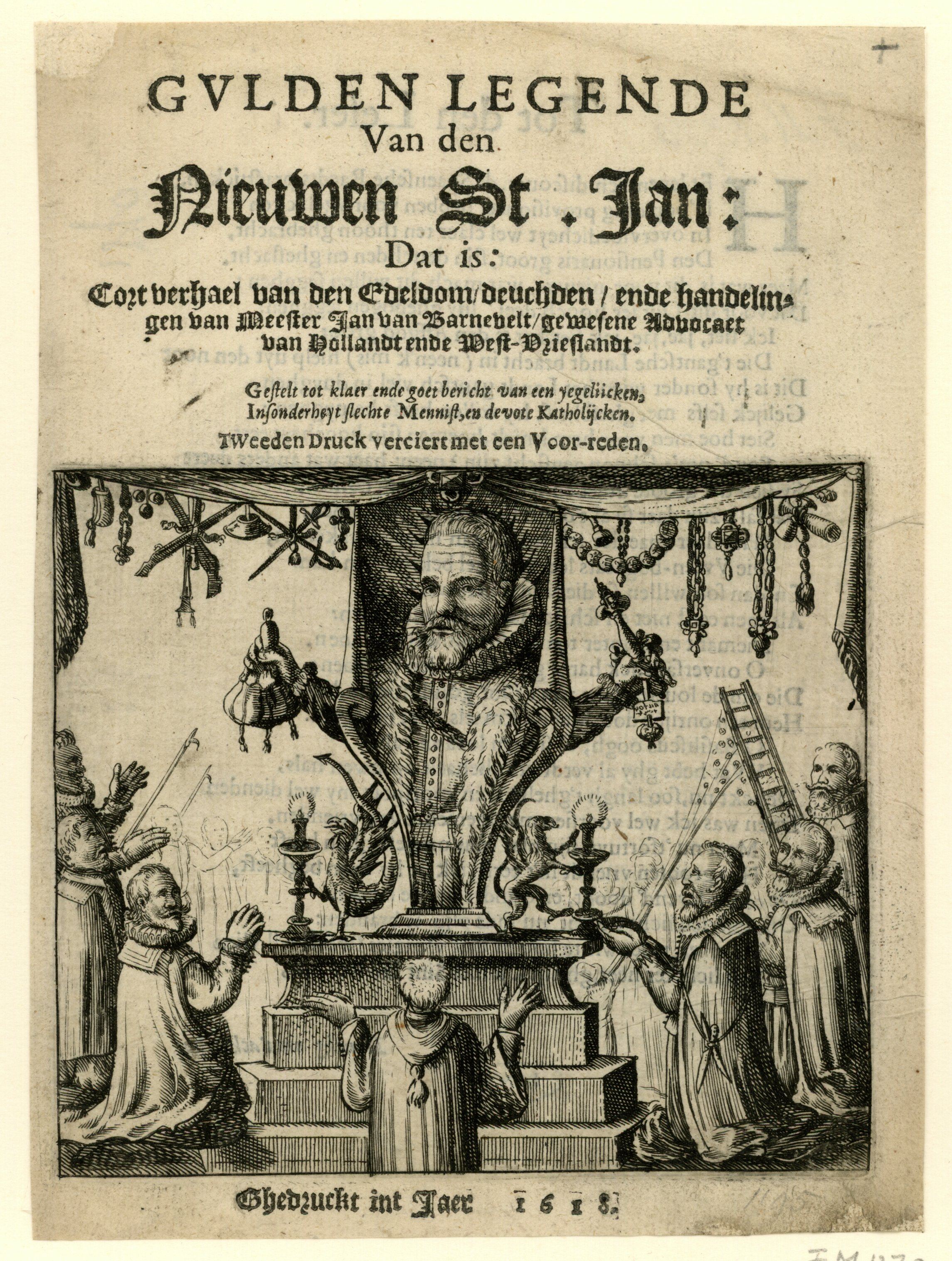 Afbeeldingen onder: 1. Omslag van een van de talrijke pamfletten die ten tijde van het proces verschenen. Oldenbarnevelt staat, devoot aanbeden als ware hij de Mammon, in het midden op een voetstuk, met in de rechterhand een zak met Spaanse munten die hij – volgens valse beschuldigingen – als steekpenningen zou hebben aangenomen. De auteur zegt dat zijn geschrift vooral bedoeld is voor ‘slechte’ doopsgezinden en devote katholieken – kennelijk gaat het erom Oldenbarnevelt af te schilderen als een verrader die de dominante positie van de calvinistische ‘publieke kerk’ wilde aantasten. Ook dat was overigens niet waar.