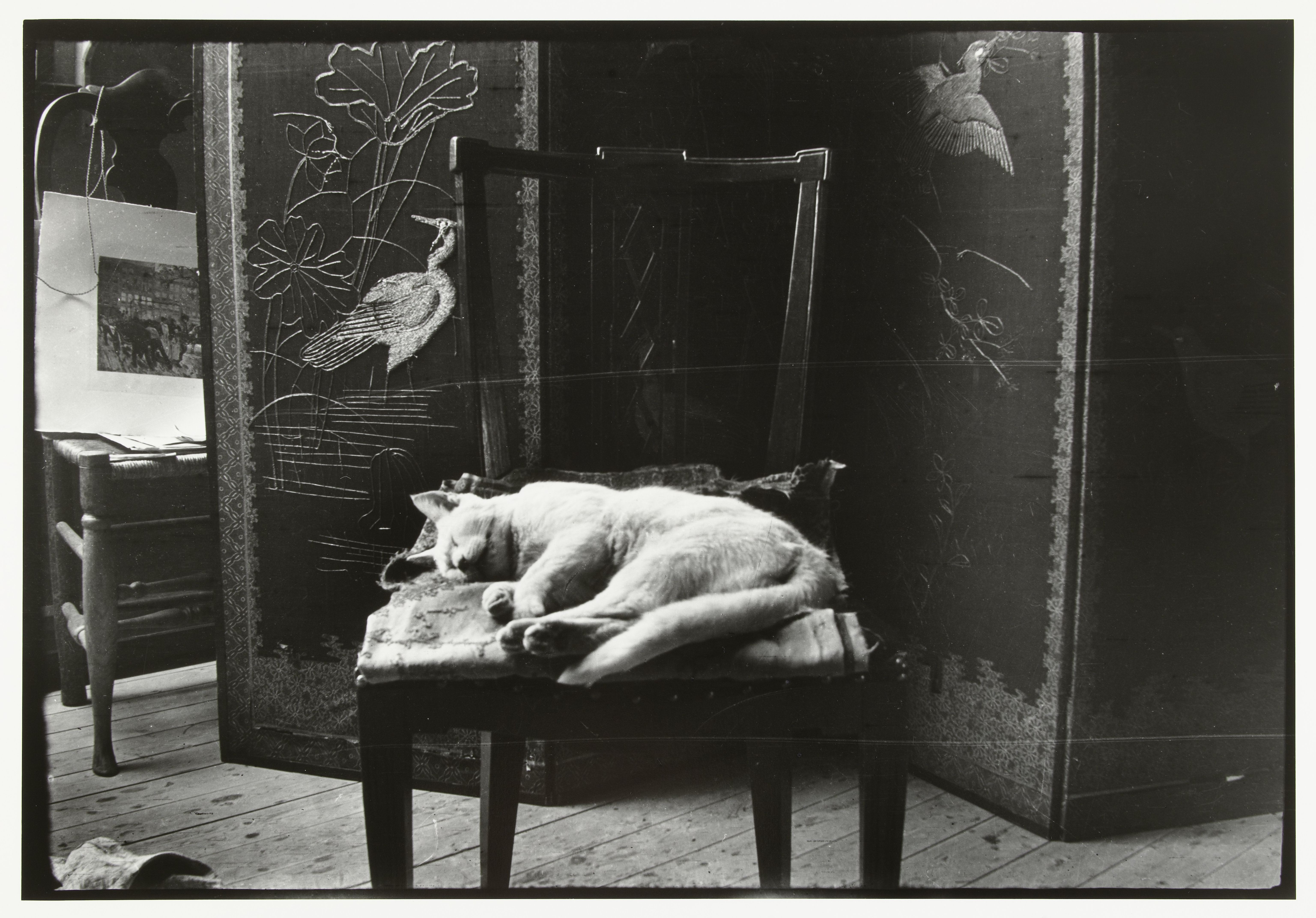 Afbeeldingen. Boven: onvoltooid schilderij van Jacobus van Looy uit 1895 (afbeelding Frans Hals Museum). Onder twee foto’s door Tachtigers gemaakt: de dichteres Lucie Broedelet met kat door Willem Witsen; en Marie Breitner-Jordan met kat door Hendrik Breitner. Daaronder nog een foto van Breitner: dezelfde witte kat, slapend in het atelier. Daaronder een tekening van Breitner. (afbeeldingen Rijksmuseum Amsterdam). En tenslotte, ter vergelijking, Olympia van Manet (zoek de kat, afbeelding Musee d’Orsay in Parijs), en een schilderij van mevrouw Ronner-Knip, die honderden katten-schilderijen op haar geweten heeft. (afbeelding Dordrechts Museum)