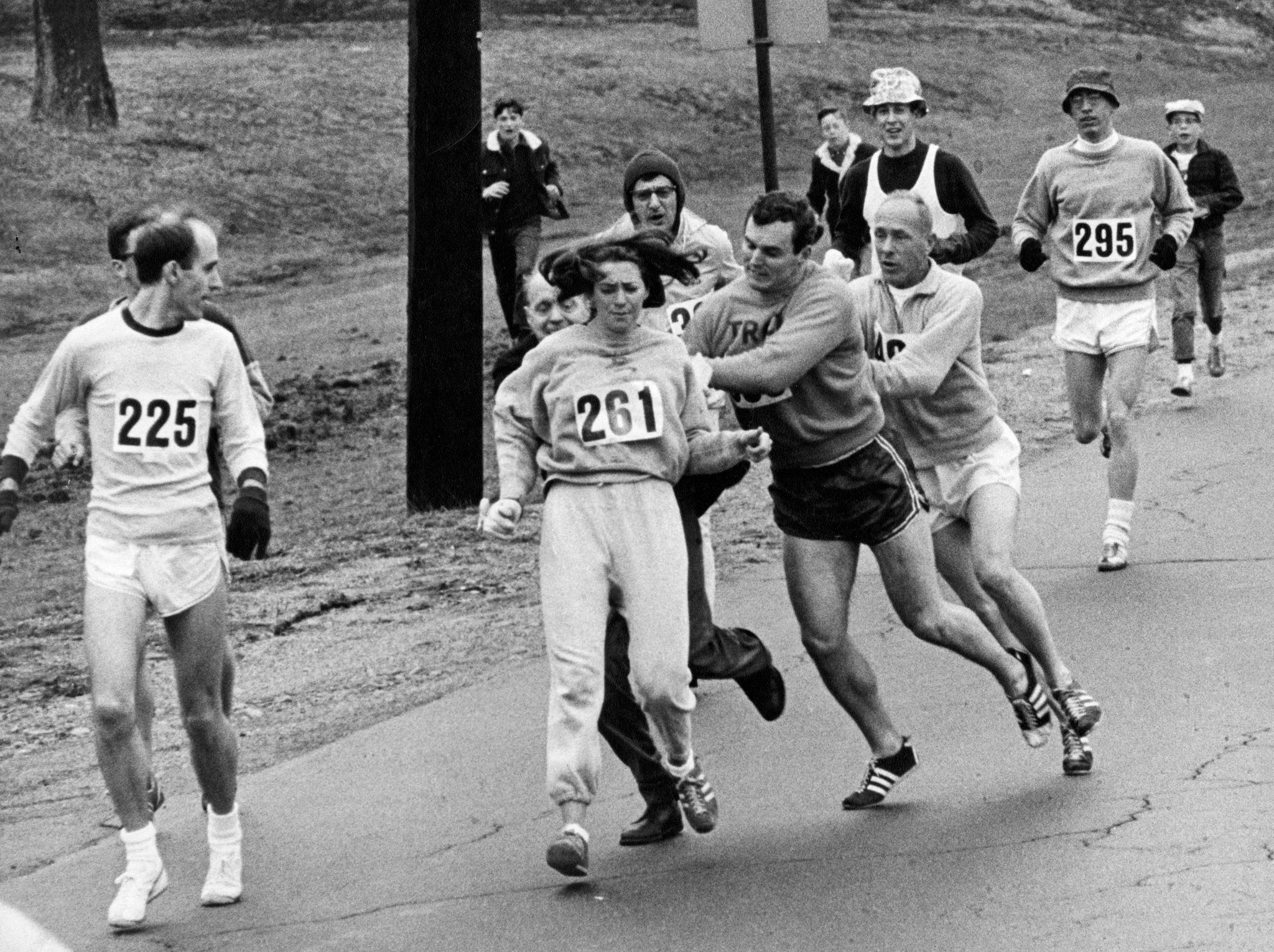 Afbeelding onder: Belangstelling voor het hoofdkwartier in New York van de National Associaton opposed to women suffrage, een in 1911 opgerichte beweging tegen vrouwenkiesrecht. (Foto Library of Congress); een functionaris van de Boston Marathon probeert in 1967 met geweld een vrouw te verwijderen. Vrouwen werden in 1972 voor het eerst tot deze marathon toegelaten. (Foto Paul Connell/The Boston Globe)