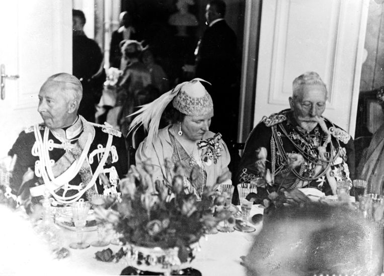 Afbeeldingen. Boven: de toenmalige prinses Juliana in 1938 tijdens een diner, gezeten aan de rechterhand van Wilhelm II. Onder: Wilhelm II op 9 november 1918 op het station van Eijsden; kolonel Luke Lea; Wilhelm II met entourage, kort na aankomst in Nederland voor Kasteel Amerongen.