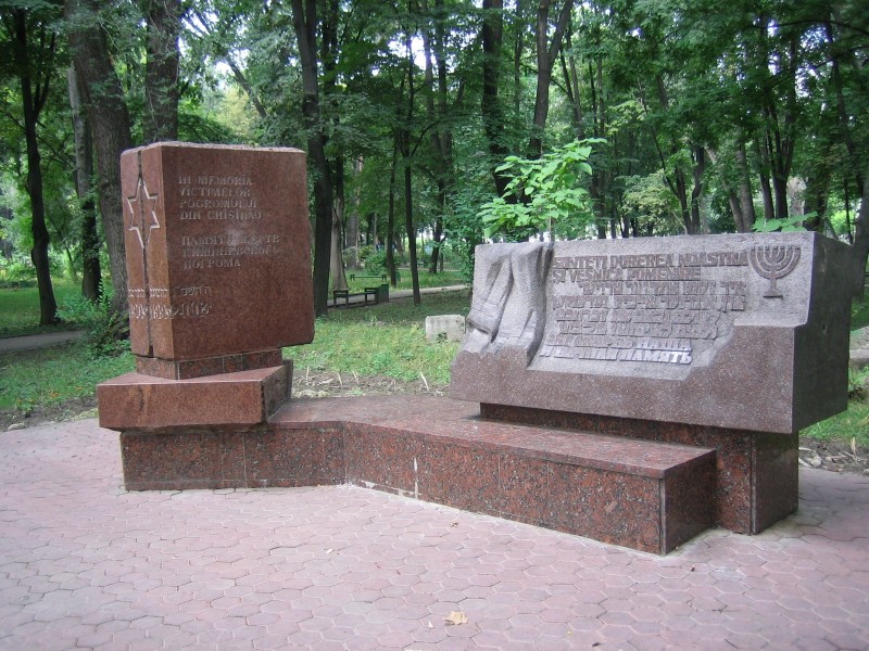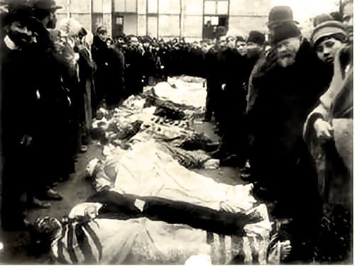 De afbeeldingen bij dit stuk zijn merendeels persfoto’s uit 1903: een joodse familie voor hun geplunderde huis (boven), lijken op straat, de plechtige begrafenis van ontheiligde Thora-rollen, de arbeiderswijk van Kisjinjov waar de ergste moordpartijen en verkrachtingen plaatsvonden. Daaronder de partituur van een in het kader van de brede verontwaardiging in de VS in 1903 gepubliceerd muziekstuk van Herman Shapiro, en het monument voor de pogrom dat nu in Chisinau staat. (Foto The Bohemian blog).