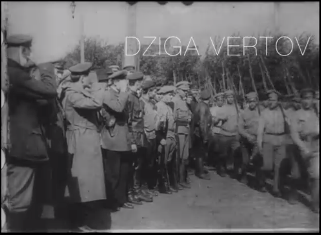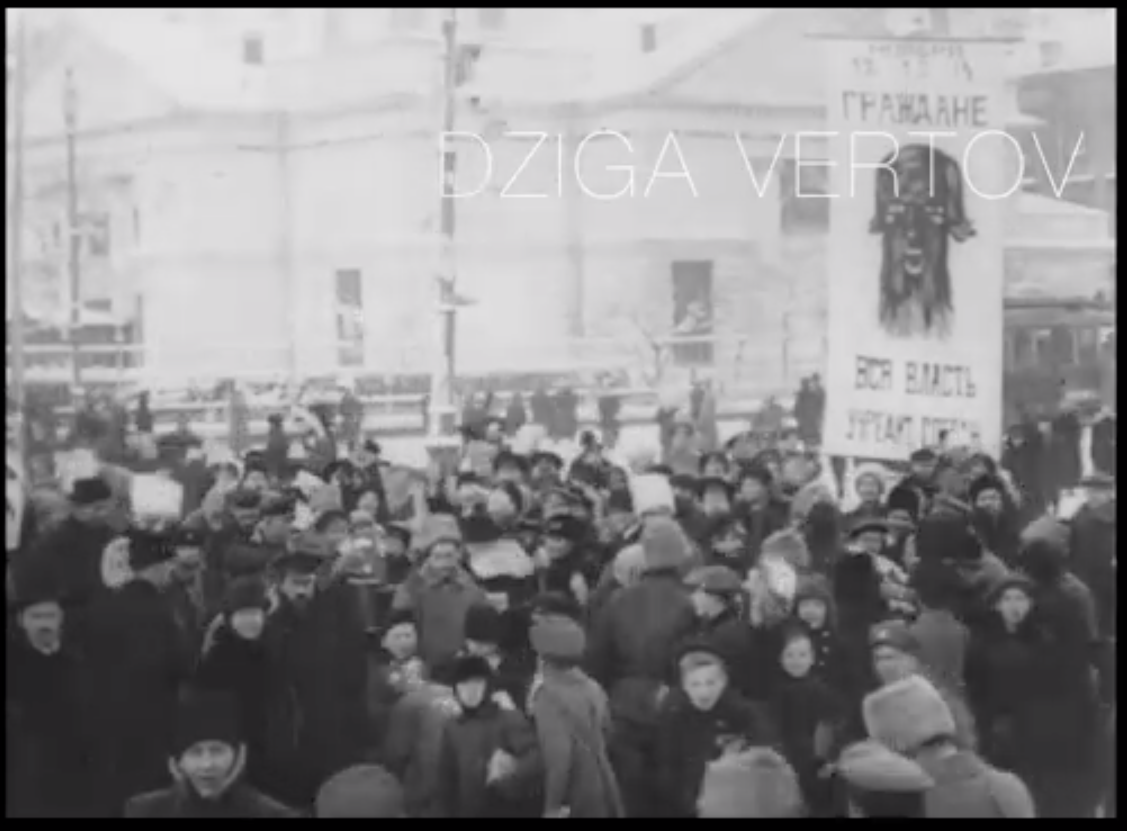 ‘Verjaardag van de revolutie’, de film die we in Eye straks gaan zien, kwam tot stand in opdracht van het ‘Volkscommissariaat voor Verlichting’, zoals het propaganda-ministerie van het bolsjewistische bewind heette. Omdat de tijd voor het schrijven van een echt scenario en het maken van nieuwe opnamen ontbrak, werd ‘Verjaardag van de revolutie’ een compilatie van opnamen uit filmjournaals, gemaakt in 1917 en 1918. De samensteller – ‘editor’, zou je nu zeggen – van deze ruim twee uur durende compilatie was een jonge filmenthousiast, de op dat moment 22-jarige David Abelevitsj Kaufman. We kennen hem beter onder de artiestennaam Dziga Vertov, waarmee hij later in 1928 de film ‘Man met de camera’ zou maken – tegenwoordig beschouwd als een van de grootste meesterwerken in de filmgeschiedenis. ‘Verjaardag’ is dus niet door Vertov zelf gedraaid, al was hij betrokken bij de collectieven die de filmjournaals hadden vervaardigd.