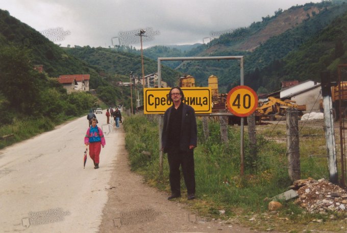 Afbeeldingen: Handke na het uitspreken van zijn grafrede voor Milosevic; Handke aan de gemeentegrens van Srebrenica, vermoedelijk in 1996.