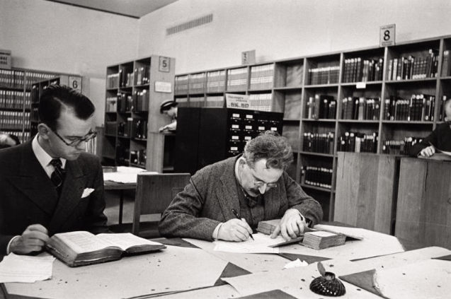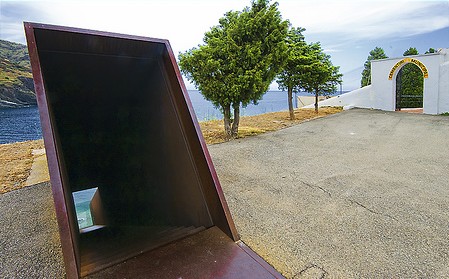 Afbeeldingen onder: 1. ‘Passagen’, Dani Karavanhe, 1994. Dit monument, een passage naar de zee, staat in het Spaanse badplaatsje Portbou, waar Benjamin zich op 25 september 1940 van het leven beroofde. 2. Walter Benjamin (rechts) in de Franse Nationale Bibliotheek in 1937. Foto van Gisèle Freund (1908-2000) (credit: Guy Carrard/ Centre Pompidou / MNAM-CCI / distr. RMN-GP)