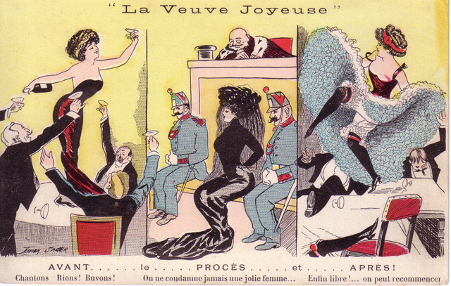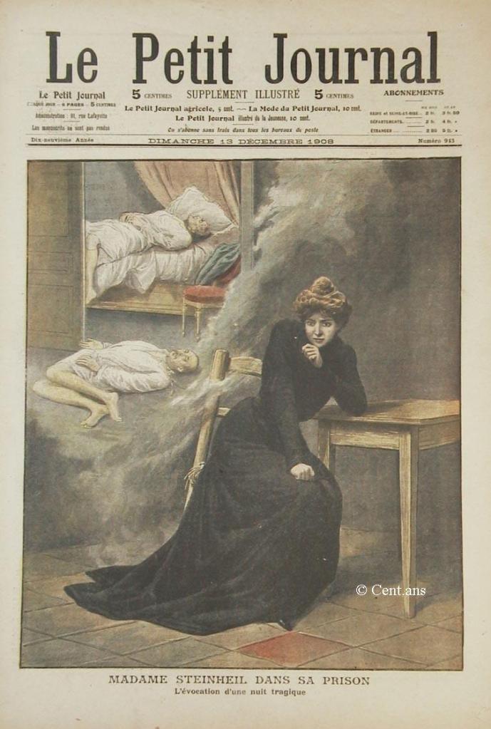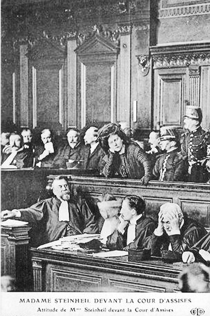 Afbeeldingen. Boven: spotprent uit de pers n.a.v. het proces in 1909. “Men veroordeelt geen knappe vrouwen”, zegt de rechter, zodat de verdachte na het proces haar vrolijke leven kan hervatten. Onder: een jeugdfoto van Marguerite Japy; Marguerite Steinheil aan de schrijftafel; schilderij van Adolphe Steinheil; het huis in Vaugirard, waar de moorden gepleegd zijn; Mme. Steinheil in de gevangenis van Saint-Lazare; attitude van de verdachte tijdens het proces; voorpagina van 13-12-1909, “de evocatie van de tragische nacht”; portret van de antisemitische schrijfster ‘Gyp’; Colette in haar pantomime ‘Rêve d’Égypte.