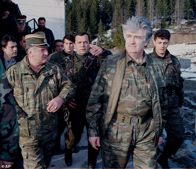 Afbeelding boven: Dragan Dabić als energie-genezer. Voor dit nieuwe leven als specialist in ‘Human Quantum Energy’ was Karadžić 32 kilo afgevallen en liet zijn baard en haar groeien. Hij was trouwens betrekkelijk succesvol in deze rol: hij had praktijk aan huis, hield lezingen en was op een lokaal tv-station in Belgrado te zien. Afbeelding onder: Karadžić met de militaire aanvoerder Ratko Mladić na een vergadering in 1993 van het parlement van de Republika Srpska, de Servische staat in Bosnië waarvan Karadžić president was en die nog steeds bestaat, met Banja Luka als hoofdstad.