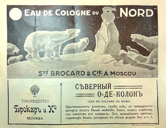 Dit werk van Kazimir Malevitsj kende u misschien nog niet: zijn flesje voor de Russische eau de cologne ‘Severni’ (Noordelijk) uit 1911 – zo’n vier jaar dus voor het ‘Zwarte vierkant’ dat zo’n belangrijke plaats inneemt in de kunstgeschiedenis. De kunstenaar was net uit Koersk verhuisd naar Moskou en ontwierp het flesje voor de firma Brocard & Co., een Frans-Russisch bedrijf dat in Moskou alleen al zo’n duizend werknemers telde. Het flesje is 19,5 centimeter hoog, en bestaat uit glas met een craquelé-motief. Op de stop staat een ijsbeer. Het ontwerp lijkt geïnspireerd door de golf van expedities naar de Noordpool in deze jaren. De Russische kunst-historica Aleksandra Sjatskich heeft in 2013 ontdekt dat het flesje – dat tot 1996 in Rusland werd geproduceerd in enigszins gewijzigde vorm en waarvan er vermoedelijk miljoenen verkocht zijn – een opdrachtwerk van Malevitsj was. Hier een reclameposter en een etiket voor ‘Severni’ uit 1911. (Tekst gaat door onder de afbeeldingen).