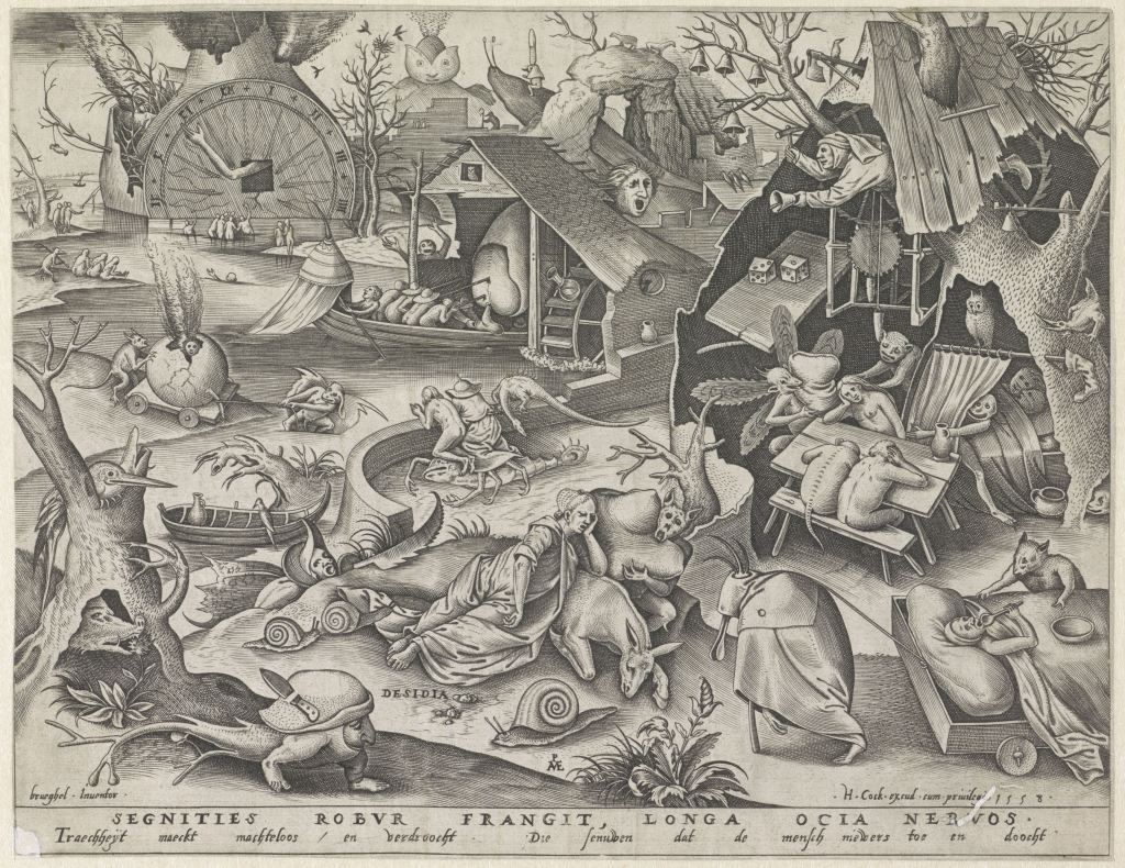1. Desidia van Pieter Brueghel de Oude, 1557. Het citaat onder de prent luidt: Traechheyt maeckt machteloos en verdroocht, die senuwen dat de mensch nieuwers toe en doocht. (Rijksmuseum, Amsterdam)