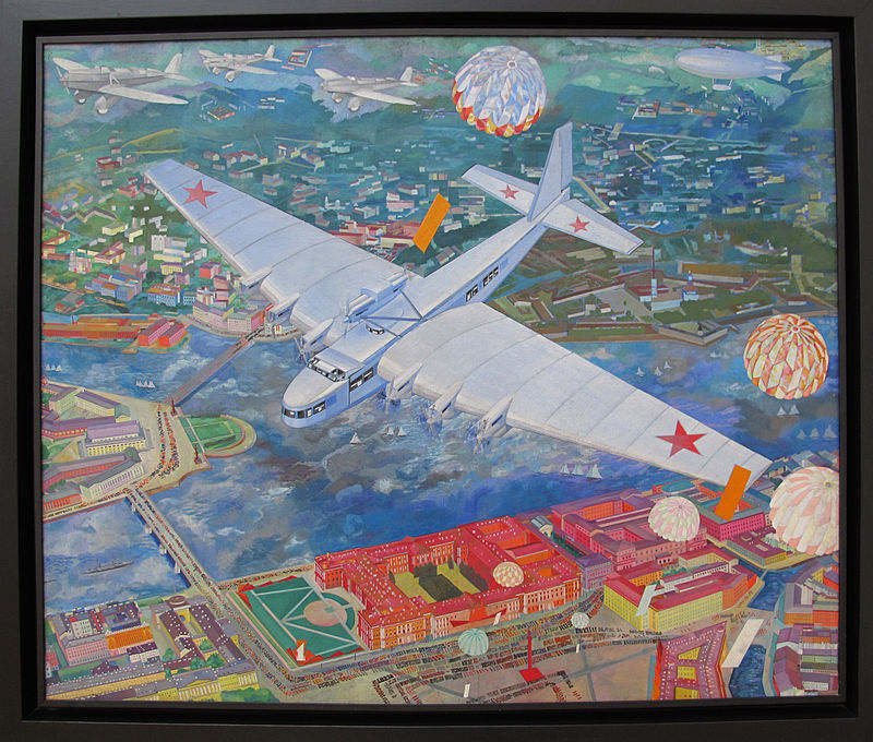 Afbeeldingen: 1. De ANT-20 Maksim Gorki boven het Rode plein in 1938. (foto Wikimedia Commons). 2. Schilderij van hetzelfde toestel van Vasili Koeptsov uit 1934 (Russisch Museum, St.Petersburg)