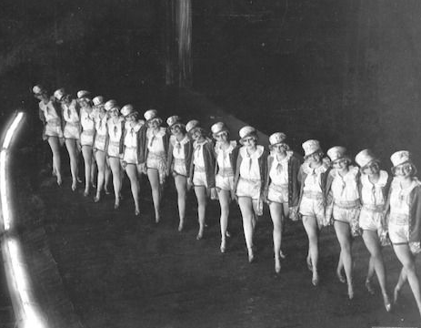 Het schilderij ‘Tiller Girls’ uit 1925, van de Bauhaus-kunstenaar Xanti Schawinsky (1904-1979), laat zich pas verstaan als je weet wat de Tiller Girls waren: een in heel de wereld beroemde dansgroep, waarin enkele tientallen danseressen tegelijk synchrone bewegingen uitvoerden. Schawinsky probeert de massaliteit van hun optreden hier tot een soort technische essentie te reduceren. En niet – zoals we nu honderd jaar later misschien zouden kunnen denken – om de ‘objectivisering’ van het vrouwelijk lichaam aan de kaak te stellen. Nee, de fascinatie die van de oorspronkelijk Britse dansgroep uitging, had te maken met de bewondering voor (en soms afschuw van) de Amerikaanse droom – een droom van efficiency en productie aan de lopende band, en van massaliteit. Zoals de aan de Frankfurter Schule verwante cultuur-criticus Siegfried Kracauer (1889-1966) in 1927 schreef, is de rij dansende meisjes doortrokken van de ‘stroom van het organische leven’. Hier een afbeelding van de Tiller Girls tijdens een optreden in Berlijn in 1925. (Tekst gaat verder onder afbeelding)