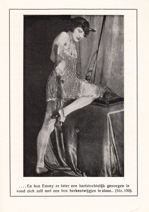 Afbeeldingen. 1. De roman ‘Het verleidelijk model van den kunstschilder’ van Hugo Beersman werd in 1934 in beslag genomen wegens te expliciete seksscènes. Alle romans van deze auteur waren trouwens verboden. 2. Na 1930 werden plots tientallen titels verboden die voorheen ongemoeid waren gelaten. Hier de ‘oogst’ van een inval in 1934. Duidelijk herkenbaar zijn enkele publicaties over naturisme. 3. Fotopagina uit ‘Domina’, rond 1930 de eerste Nederlandse ‘flagellantische’ roman, van de hand van Carla van Zeeland. Dit werk, waarin het kastijden van meisjesbillen centraal staat, werd door het Rijksbureau ongemoeid gelaten. (Alle afbeeldingen uit ‘De zedeloze jaren 30’).