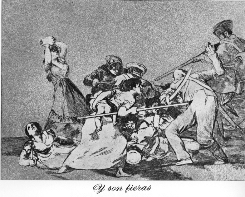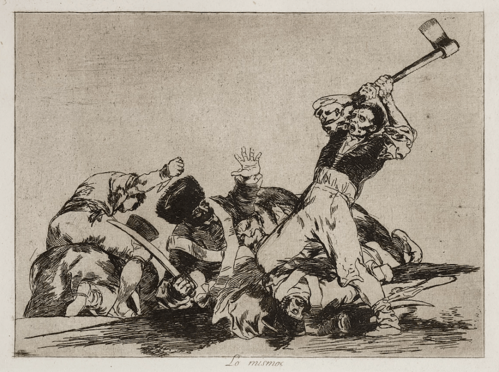 Afbeeldingen: 1. ‘Gas attack Liéven’ van de Canadese schilder A.Y. Jackson (1918). Het bijzondere aan dit schilderij is dat Jackson een aanval met gifgas aan het front verheft tot een fraai schouwspel. Of zoals de schilder zelf heeft geschreven: “I went (..) one night to see a gas attack we made on the German lines. It was like a wonderful display of fireworks, with our clouds of gas and the German flares and rockets of all colours.” (Canadian War Museum). 2 en 3: Twee etsen uit de serie ‘Los Desastres de la Guerra’ (‘De verschrikkingen van de oorlog’) van de Spaanse kunstenaar Francisco José de Goya y Lucientes (1746 – 1828). De etsen werden pas na het overlijden van de kunstenaar bekend. Ze geven een indruk van gevechten in de Frans-Spaanse oorlog na de inval door Napoleon in 1808, en lijken een illustratie van wat wel ‘the fog of war’ genoemd wordt: het chaotische, onoverzichtelijke geweld dat eigen is aan de strijd in een oorlog.