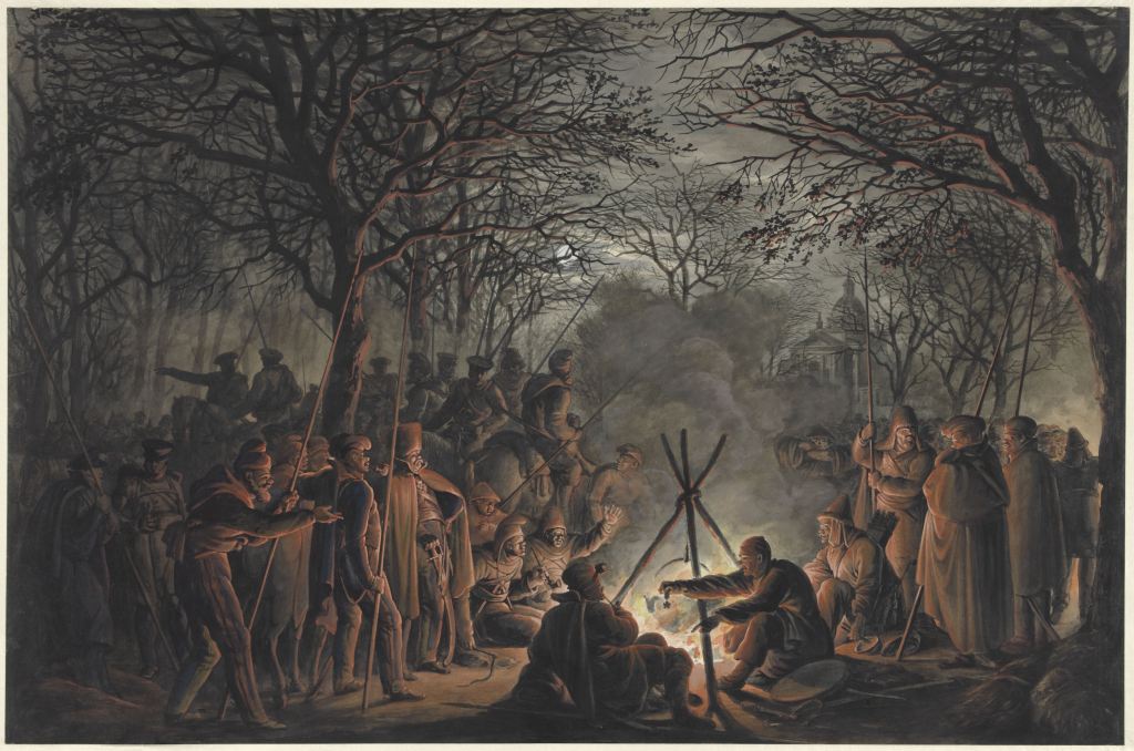 2. Twee jaar later zijn de verhoudingen geheel anders. Na de aftocht van de Fransen slaan (Russische) kozakken, bevrijders zou je kunnen zeggen, op bijna dezelfde plek hun tenten op. Op de achtergrond de Muiderpoort. Schilderij uit 1813 van François Joseph Pfeiffer (1778-1835). (Rijksmuseum)