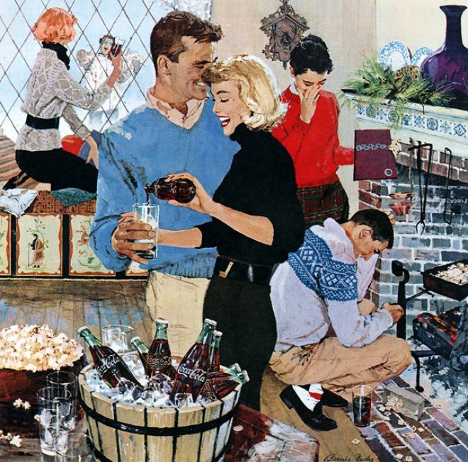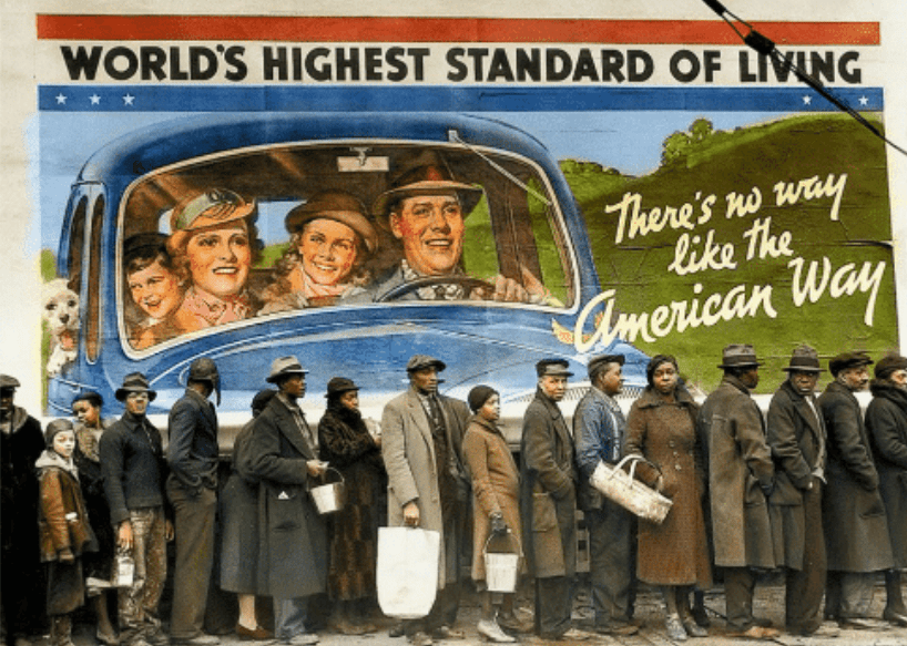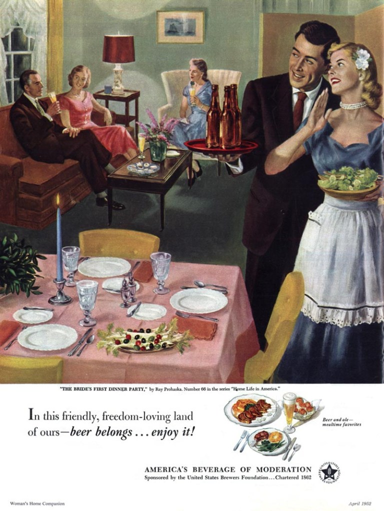 Afbeeldingen: 1. en 2. Amerikaanse reclame-uitingen uit de jaren 1950 en 1960, waarin de ‘American way of life’ centraal staat. 3. De bierreclame is een tekening van Ray Prohaska (1901-1980). 4. Een (ingekleurd) straatbeeld, ergens in Kentucky in 1937.