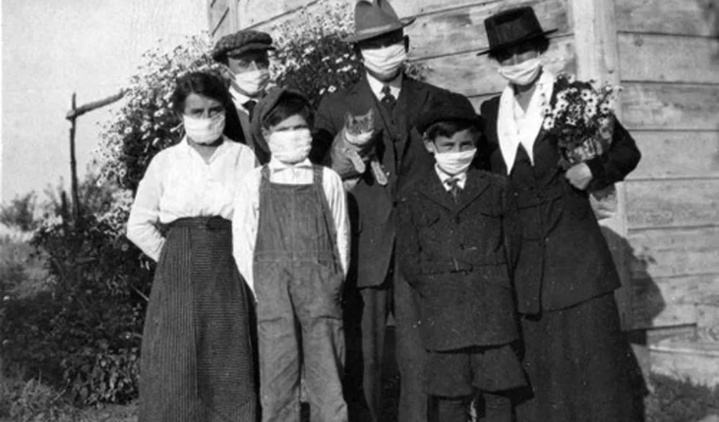 Afbeelding: Amerikaans gezin beschermt zich met mondkapjes tegen de Spaanse griep in 1918. Zelfs de kat draagt er een. (Foto Getty)
