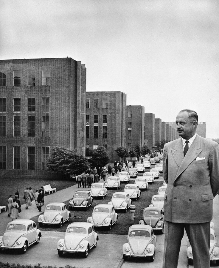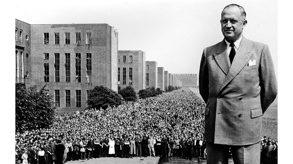 Jähner staat uitvoerig stil bij de ontwikkeling van de Volkswagen-fabrieken in Wolfsburg. Het voertuig dat later als ‘kever’ bekend zou worden, was een initiatief van Hitler zelf. Van de massale invoering van een goedkope auto voor het volk kwam door de oorlog echter weinig terecht: in Wolfsburg – overigens toen nog geen stad maar een enorm grote verzameling van arbeidersbarakken en een kamp voor dwangarbeiders – werden tot 1945 voornamelijk militaire jeeps geproduceerd. De echte ‘boom’ van de kever kwam pas na de oorlog. In 1955 waren er in Wolfsburg een miljoen gebouwd – reden voor de toenmalige directeur Heinrich Nordhoff om zich op het plein van de onderneming behalve met het product ook met het voltallige personeel te laten vereeuwigen. Wat Hitler bedoeld had als propaganda voor zijn Nazi-bewind – ieder gezin een eigen autotje – werd een weldaad in het democratische Duitsland. (Tekst gaat door onder de afbeeldingen).