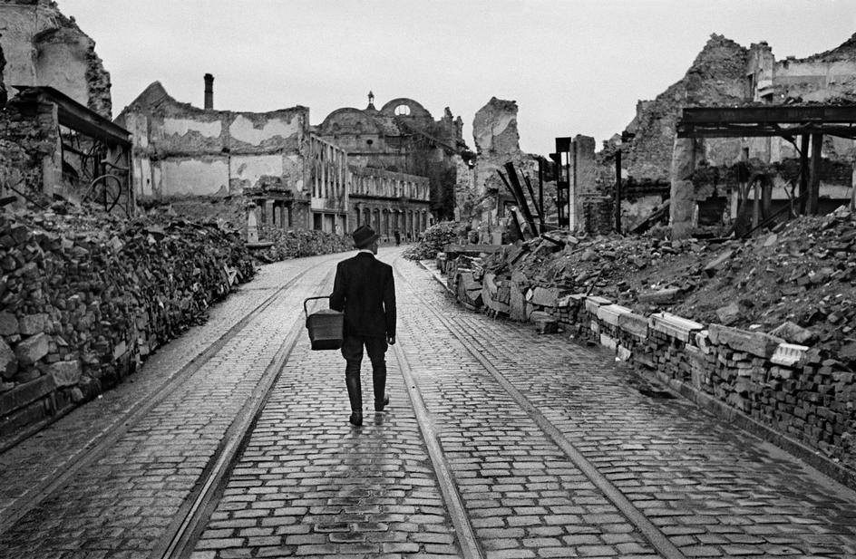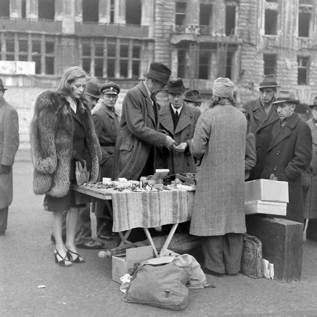 Afbeeldingen: 1. Hildegard Knef op de zwarte markt, Alexanderplein Berlijn, 1947. (Foto Walter Sanders, Life); 2 en 3. Directeur Heinrich Nordhoff in 1955 naast de Volkswagen-fabriek in Wolfsburg; 4 en 5. Affiches voor de film ‘Die Sünderin’; 6 en 7. Straatbeelden in Berlijn van Werner Bischof, 1946.