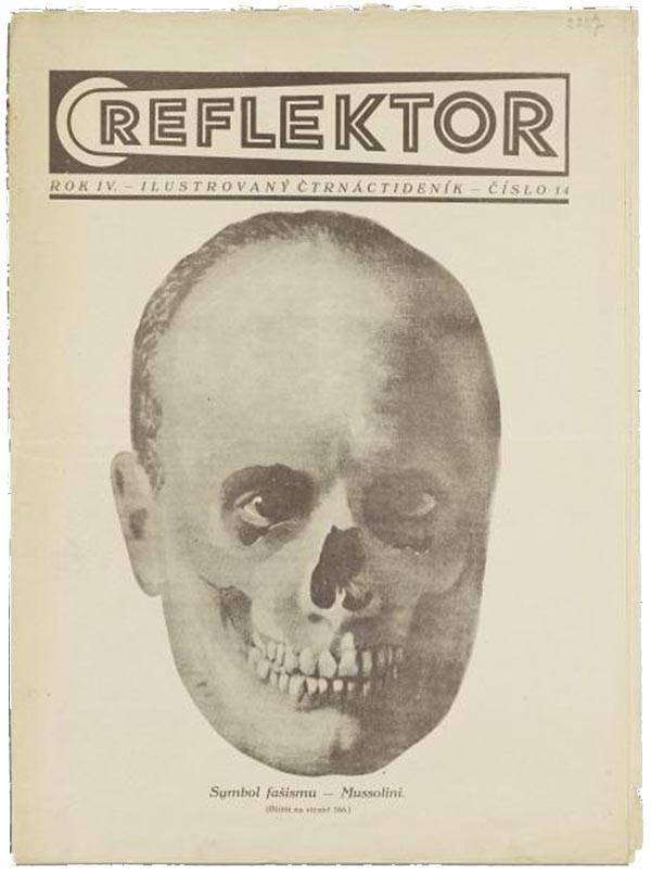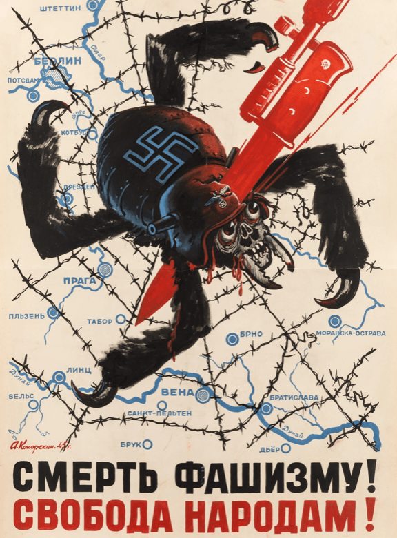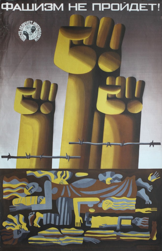 Afbeeldingen: 1. ‘Dood aan het fascisme, vrijheid voor het volk’. Sovjet-poster van Aleksej Kokorekin uit 1944; 2. ‘Het fascisme komt er niet door’, Sovjet-poster uit 1983 van V. Karsjakov en L. Levsjakova. 3. Fotomontage over Mussolini van John Heartfield uit 1928, en 4. een hedendaagse variatie op de fotomontage van Heartfield door de Amerikaanse kunstenaar Winston Smith.
