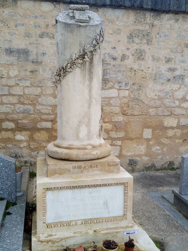 Afbeeldingen: 1. Portret van Flora Tristan. Litho van Jules Laure, met wie Tristan bevriend was (1847). 2. Marmeren gedenkteken voor Flora Tristan op het Cimétière de la Chartreuse in Bordeaux, in 1848 – blijkens de plaquette – geplaatst door ‘Les travailleurs reconnaissants. Liberté – Égalité – Fraternité – Solidarité’.