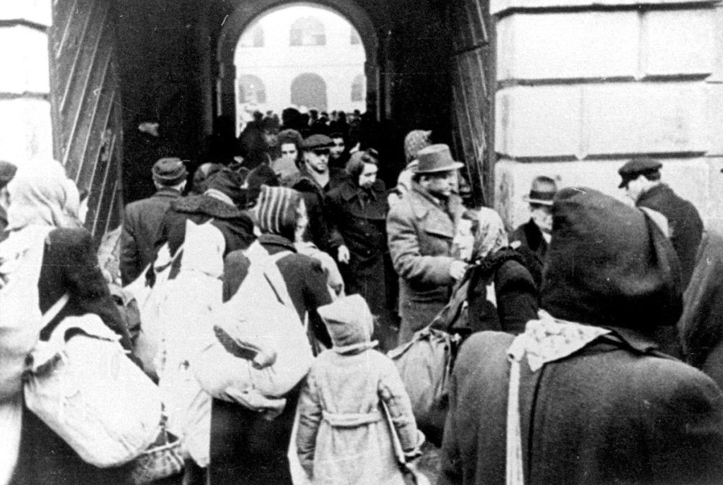 Afbeeldingen: 1. Aankomst van een transport Nederlandse joden in Theresienstadt. (Beeldbank WO2-NIOD, 67835). 2 en 3. Publiciteitsfoto’s van Proditione/Vince Pankoke, als afgedrukt in de NRC van 17-1-2022.