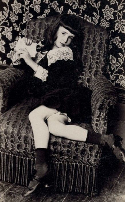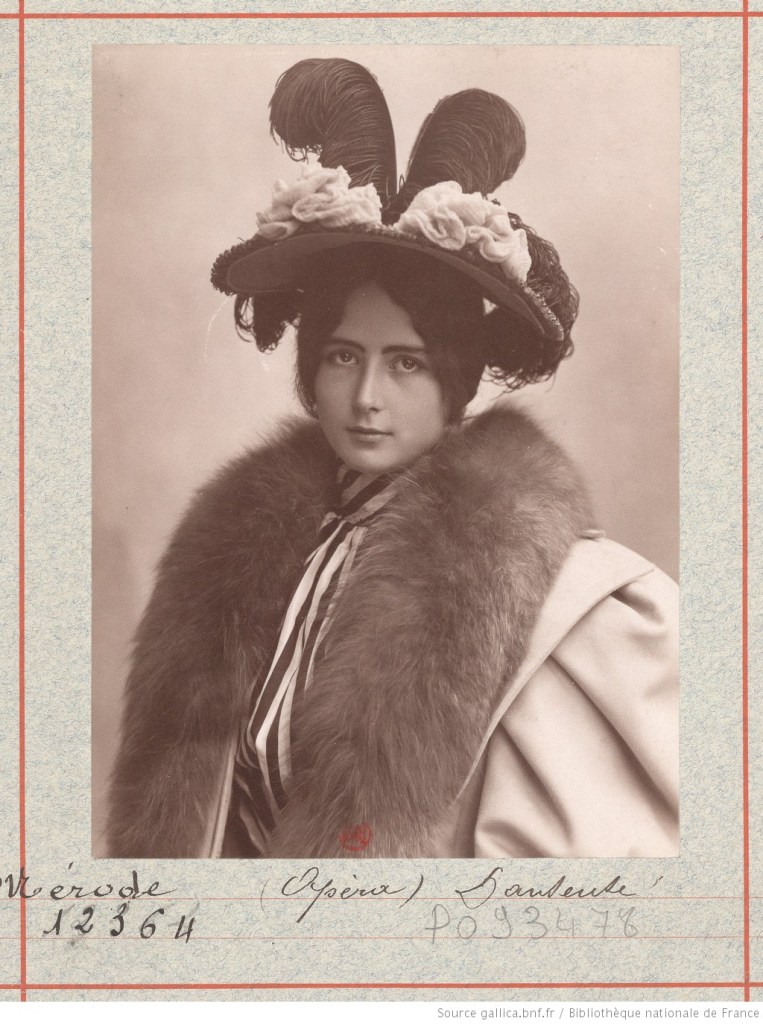 Die foto’s zijn, dit even voor alle duidelijkheid, netjes. Met de fotografische pornografie, die in deze jaren eveneens in opkomst is, hebben de afbeeldingen niets te maken. Mérode poseerde eerder zedig, als een reine maagd – wat een erotisch effect natuurlijk in het geheel niet uitsloot. Een eigenaardigheid van alle foto’s die van haar bestaan, is dat de oren altijd achter het haar verborgen blijven – wat aanleiding gaf tot geruchten over misvormingen. Na 1900 veranderde de haardracht overigens – van de traditionele lange haren van de XIX-de eeuw naar de ‘chignon’, waarin het haar achterop de schedel in een knot gedragen werd. (Tekst gaat door onder de afbeelding)