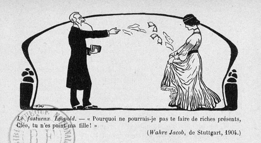 Koning Leopold II stond – net als zijn latere collegae-vorsten Edward VII en Willem III – bekend als wat een ‘rokkenjager’ werd genoemd, die zich de door de courtisanes en de vrouwen in de Parijse ‘Maisons closes’ geboden geneugten goed liet smaken. Maar dat hij nu ook iets had met de zich zo zedig voordoende Cléo de Mérode was groot nieuws, waar de pers zich gretig op stortte, ook in België, waar de koning en zijn geld- en levens verslindende koloniale avontuur in Congo veel politieke vijanden had. Het regende aan beide zijden van de grens jarenlang karikaturen waarin de verbinding tussen beiden – ook wel als ‘Cléopold’ omschreven – uitvoerig op de hak werd genomen. (Tekst gaat door onder afbeeldingen).