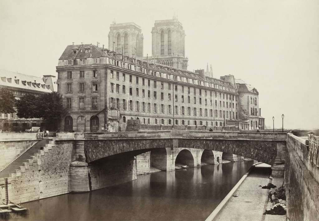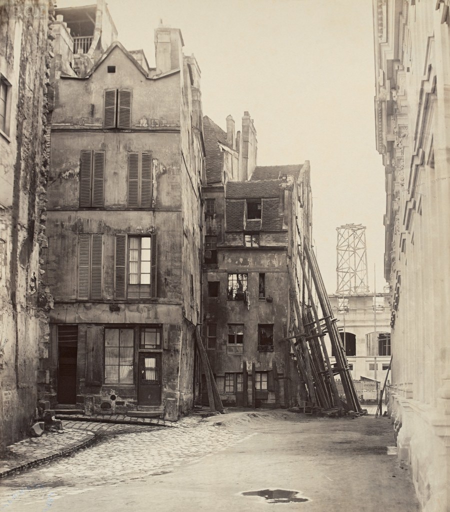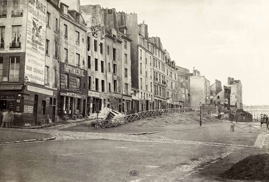 Afbeeldingen. 1: Rue du Marché aux Fleurs, gezien vanaf quai Desaix, Île de la Cité, Parijs IVe, 1865; 2: L’Hôtel-Dieu, gezien vanaf quai Saint Michel, Parijs IVe, rond 1867; 3: Rue Champlain, Parijs XXème, 1877/1878; 4: Interieur van het Hôtel de Ville na de brand in 1871; 5. Rue du Clos Bruneau, gezien vanaf de Rue des Écoles, Parijs Ve, rond 1865. Alle foto’s van Charles Marville (Musée Carnavalet of BHVP).