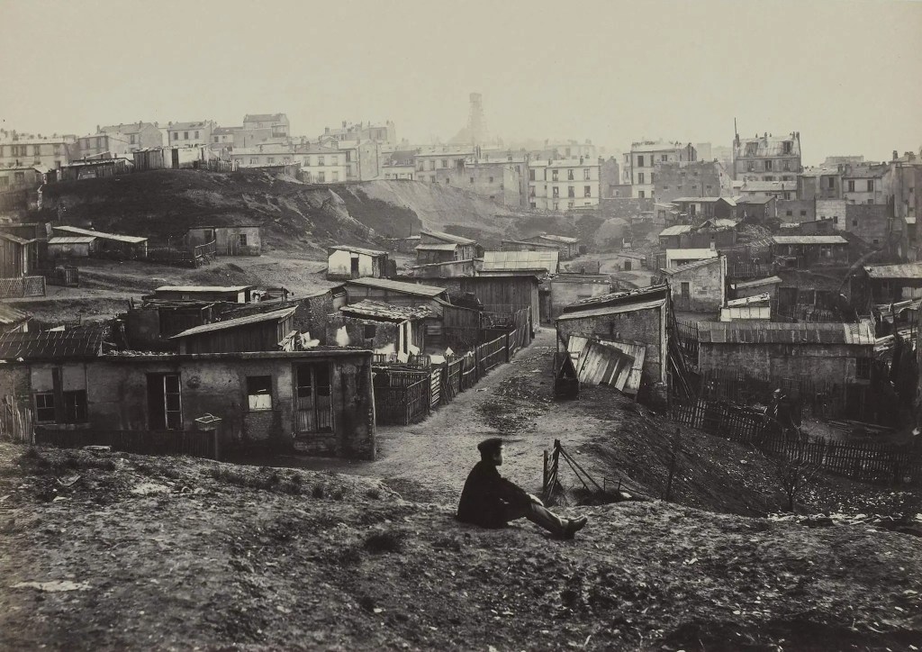 Inderdaad voltrok zich in Parijs intra muros in de tweede helft van de negentiende eeuw een soort klassenscheiding, waarbij – grof gezegd – de rijken naar het Westen van de stad trokken – de wijken rond de Arc de Triomphe zeg maar – terwijl de bevolking aan de oostkant van de stad meer ‘volks’ was, om het zo maar even uit te drukken. En inderdaad ontstonden er rondom de stad armelijke wijken – die je nu ‘bidonsvilles’ zou noemen – waar mensen woonden die werkten in de metropool waar zij in de meeste gevallen nooit een woning zouden kunnen betalen.