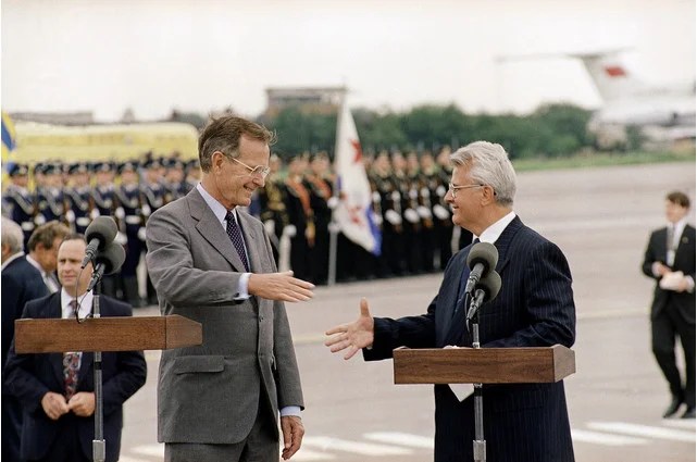 Afbeelding: De Amerikaanse president George H.W. Bush wordt op 1 augustus 1991 op het vliegveld van Kiev verwelkomd door Leonid Kravtsjoek, op dat moment de Communistische partijleider van de Sovjet-republiek Oekraïne, en daarna de eerste president na de onafhankelijkheid.