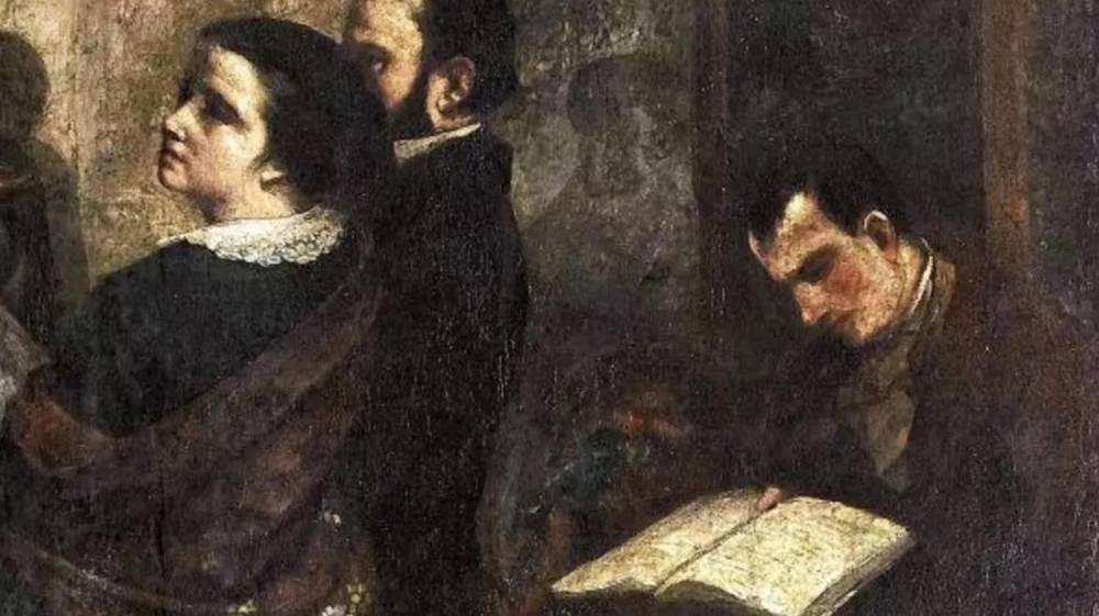 Baudelaire staat op het doek ook afgebeeld, helemaal rechts, over een boek gebogen. De dichter is ook verantwoordelijk voor een van de merkwaardigste aspecten van het doek: het ontbreken van Jeanne Duval, de zwarte maîtresse van Baudelaire, die eerst naast de dichter tegen een pilaar geleund stond maar om onduidelijke redenen door Courbet later is weggeschilderd. Misschien houdt de verdwijning verband met het stormachtig verloop van de verhouding tussen Baudelaire en Duval. Sinds het schilderij een paar jaar geleden is gerestaureerd, zijn haar contouren duidelijk zichtbaar geworden.