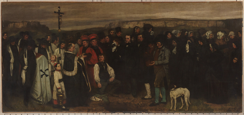 Wat de ‘Enterrement’ voorstelt is vrij duidelijk: een begrafenis in het stadje in de Franche-Comté waar Courbet vandaan kwam (en waar tegenwoordig trouwens een erg aardig Courbet-museum gevestigd is). Ofschoon het thema van de begrafenis anders zou doen vermoeden heeft Courbet dit doek niet bedoeld als een religieus werk, maar eerder als wat in deze tijd in de schilderkunst ‘Realisme’ ging heten. Ook de oorspronkelijke naam die Courbet het werk gegeven had, wijst in die richting: ‘Tableau de figures humaines, historique d’un enterrement à Ornans’. Het is met name het gebrek aan ‘verhevenheid’ dat Courbet veel kritiek opleverde, toen het doek in 1850 te bezichtigen was in de ‘Salon’, de jaarlijkse consecratie van de Franse schilderkunst, die werd samengesteld door een jury die meestal bestond uit oudere, gearriveerde kunstenaars. Veel critici begrepen niet waarom zoveel ‘lelijke’ mensen, bovendien nog verzameld voor wat niet meer leek te zijn dan een routineuze plechtigheid, zo’n groot doek waard waren.