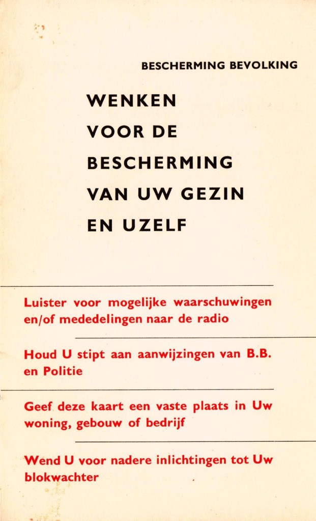 Altijd als de Cuba-crisis ter sprake komt, word ik herinnerd aan wat mijn eerste herinnering is. In de bijkeuken van ons huis staat een grote voorraadkast. Mijn moeder opent de kastdeur en de kast staat vol met blikken met groente, keurig gestapeld zoals in een supermarkt (die toen nog niet bestonden). Mijn moeder zegt: ‘Het komt misschien oorlog.’ Later heb ik gereconstrueerd dat deze oerscène zich moet hebben afgespeeld in 1962. Ik was toen zes jaar oud, wat wellicht laat is voor een ‘eerste’ herinnering. Mijn moeder had een buitengewoon talent om haar angsten op haar kinderen over te dragen. Het woord ‘bang’ lag op haar lippen bestorven. De scène is dus niet alleen ‘echt’, maar ook ‘symbolisch’, een perfecte mix om een bronverhaal van mijn leven te worden. Na de dood van mijn moeder vond ik de brochure ‘Wenken’ in een boekenkast die ik leegruimde. Vergeeld, maar nooit weggegooid. Gek genoeg heb ik nooit een connectie gelegd met de alarmtest op de eerste maandag van de maand, die overigens in mijn werkkamer luid en duidelijk doorklinkt. Ik kan er door je blog nu op rekenen dat die oerscène mij minstens één keer per maand voor de geest komt….