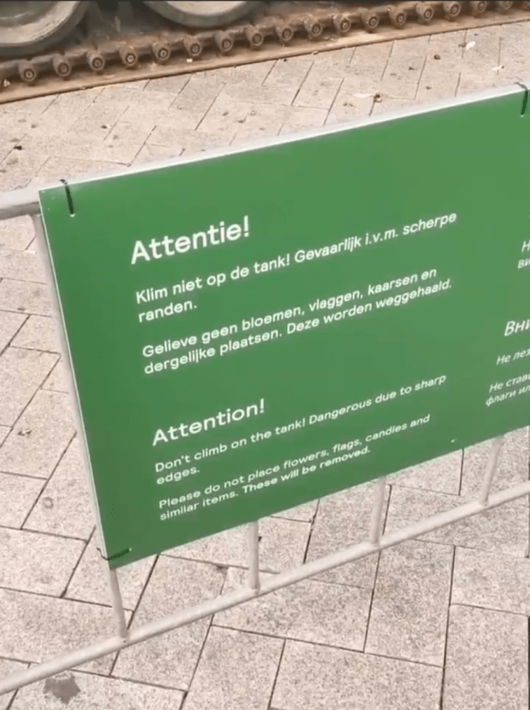 Inmiddels wordt duidelijk dat de introductie van geweldssymboliek in de openbare ruimte tot agressie in een opgefokte sfeer leidt – zoals De Balie en de Gemeente Amsterdam ook hadden kunnen voorzien. De directeur van De Balie heeft excuses aangeboden omdat hij met geweld de microfoon van een hem onwelgevallige verslaggever probeerde af te pakken. Demonstranten die kennelijk pro-Poetin waren hebben geprobeerd de toespraak van de burgemeester te verstoren. En het gesprek over de kwetsbaarheid van de democratie, dat De Balie zegt te willen bevorderen? Naast de tank hangen nu bordjes dat het niet de bedoeling is bij de tank bloemen, kaarsjes e.d. neer te leggen. ‘Deze zullen worden weggehaald’, zegt het bordje. De bedoeling van de tank zou zijn het debat op gang te brengen, maar kennelijk alleen binnen de door de organisatoren vastgestelde kaders.