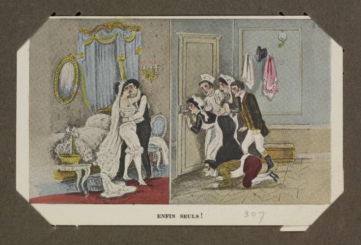 ‘Enfin seuls’, ‘eindelijk alleen’ wordt een bekende kreet waarvan iedereen weet wat ermee aangeduid wordt, en onderwerp vormt van talloze liedjes, grappen en prentbriefkaarten. Het moment van de waarheid sprak natuurlijk tot de verbeelding, al bestond er verbazingwekkend weinig literatuur over. Litteraire beschrijvingen van de huwelijksnacht traden verrassend zelden in fysieke details, en ook in de voorlichtingsboekjes en stichtelijke verhandelingen die verkrijgbaar waren, werden eigenlijk nooit de eigenaardigheden van de penetratie behandeld. (Tekst gaat door onder afbeelding).