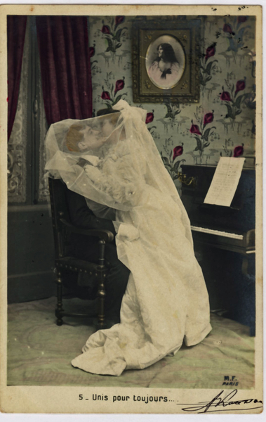 Afbeeldingen: 1: ‘Enfin seuls’ prentbriefkaart, vermoedelijk Frans of Belgisch uit 1905. Hotelpersoneel poogt een glimp op te vangen van de huwelijksnacht. (Uit de Milford Haven Collection in het Victoria&Albert-museum in Londen); 2: ‘Verenigd voor altijd’, Franse prentbriefkaart uit 1920. (Geneanet.org); 3: ‘Le coucher de la mariée’, een Franse film uit 1896 van Albert Kirchner, heeft de huwelijksnacht als onderwerp en wordt beschouwd als de eerste erotische film uit de geschiedenis. De bruid, gespeeld door de revue-artieste Louise Willy, kleedt zich uit terwijl de bruidegom achter een kamerscherm zijn beurt afwacht. De film, feitelijk een striptease, was geënt op een pantomime die eerder met veel succes in een Parijs theater te zien was geweest. Van de zeven minuten film zijn slechts de eerste drie bewaard gebleven, die in 1996 zijn ontdekt en op Youtube te zien zijn.
