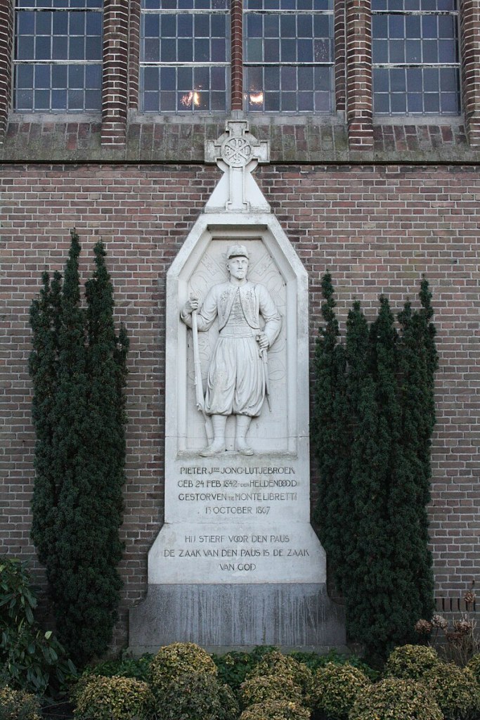 Eén zoeaaf bracht het tot heldenstatus in het katholieke Nederland van de negentiende eeuw: Pieter Jong uit het Noord-Hollandse Lutjebroek. Bij de slag van Montelibretti in 1867, waarbij ook zeven andere Nederlanders sneuvelden, zou hij heldhaftig met de kolf van zijn geweer vijftien tegenstanders hebben uitgeschakeld, alvorens zelf aan een vijandelijke bajonet te worden geregen. De ontwerper Pierre Cuypers – die van het Centraal Station en het Rijksmuseum in Amsterdam – heeft een grafmoment voor hem ontworpen dat tot op huidige dag in Lutjebroek kan worden bewonderd. De tekst geeft aan waarin de betekenis van zijn heldendood ligt: ‘Hij stierf voor den paus. De zaak van den paus is de zaak van God’. En toch is het met de katholieke emancipatie in Nederland helemaal goed gekomen. We mogen de hoop niet opgeven dat het met teruggekeerde IS-strijders net zo zal gaan.